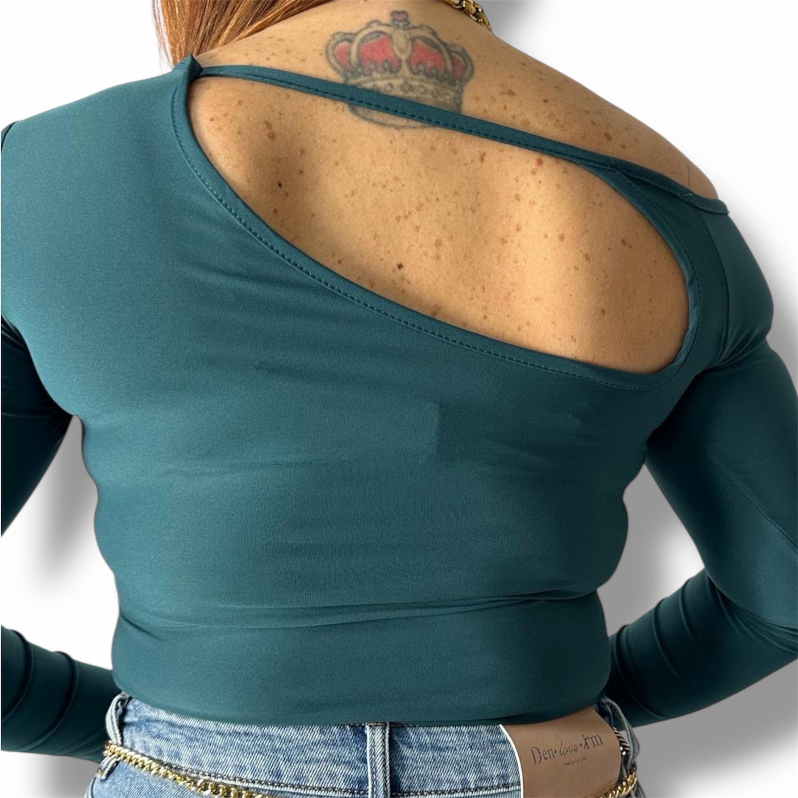 Body a manica lunga in tessuto aderente, caratterizzato da un seducente scollo asimmetrico cut-out e ampia apertura sulla schiena. Perfetto per outfit serali eleganti.