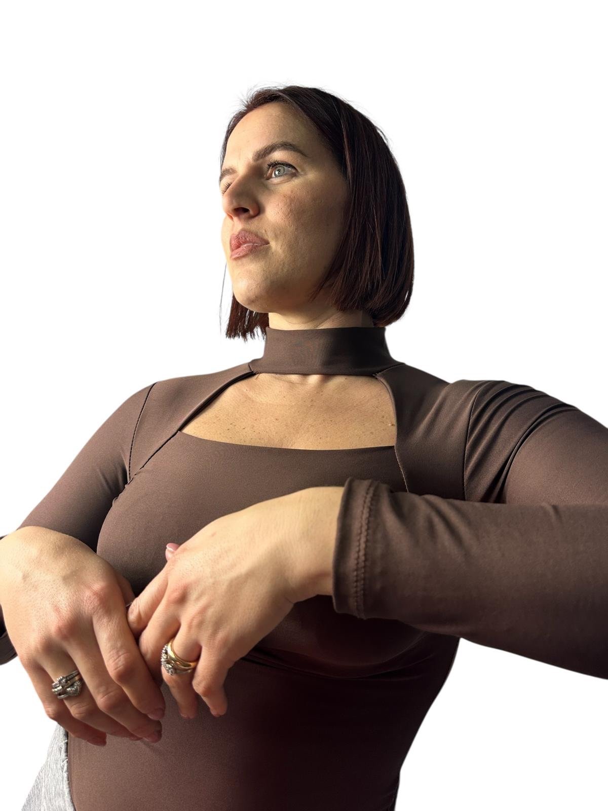 Design Unico: Questo body si distingue per la sua combinazione di dettagli chic e seducenti. Presenta un collo alto strutturato abbinato a un cut-out (apertura) centrale sul décolleté, che aggiunge un tocco audace ma di classe.