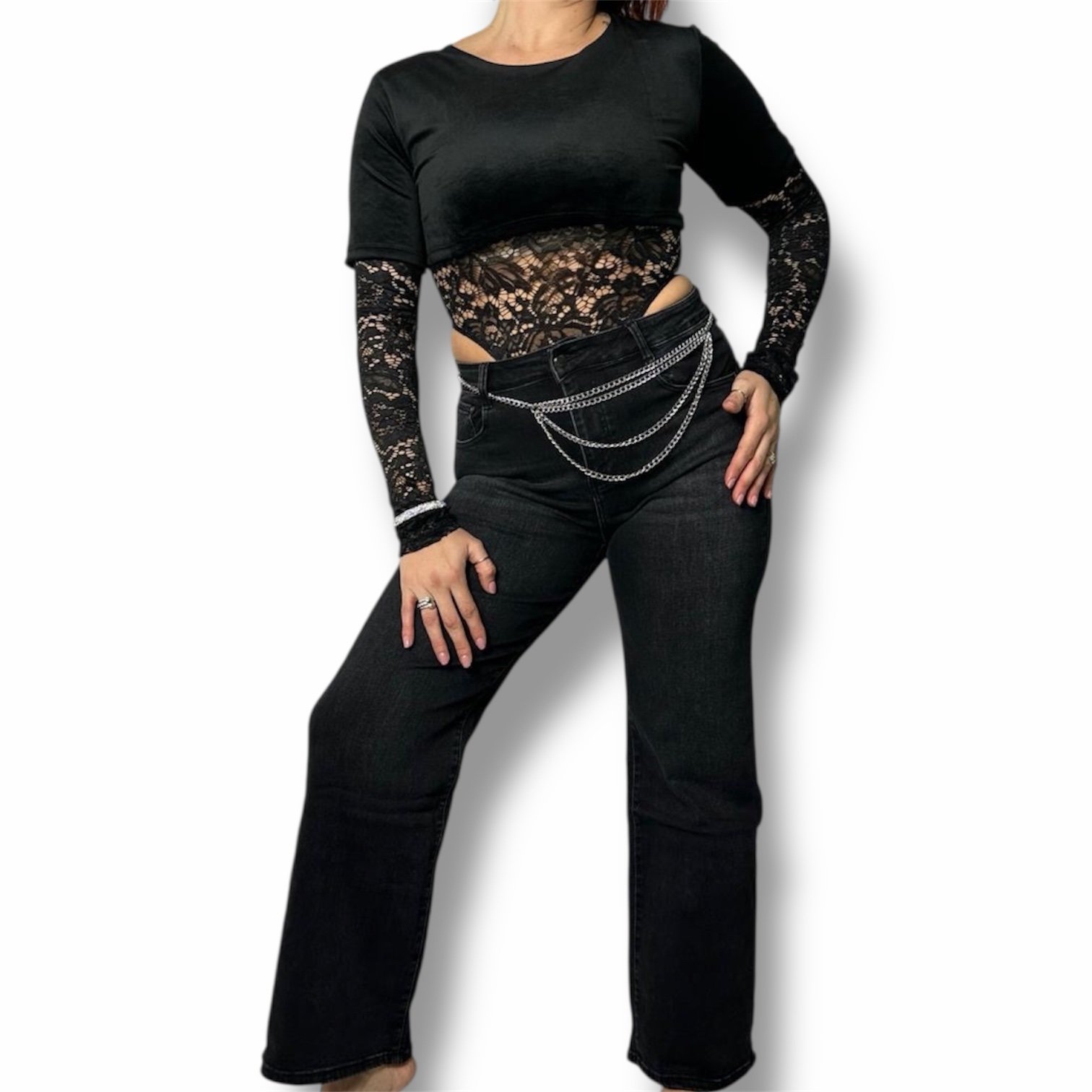 Recensisci per primo “Body Elegante a Maniche Lunghe in Pizzo Trasparente e Tessuto Crop Effetto Velluto”
