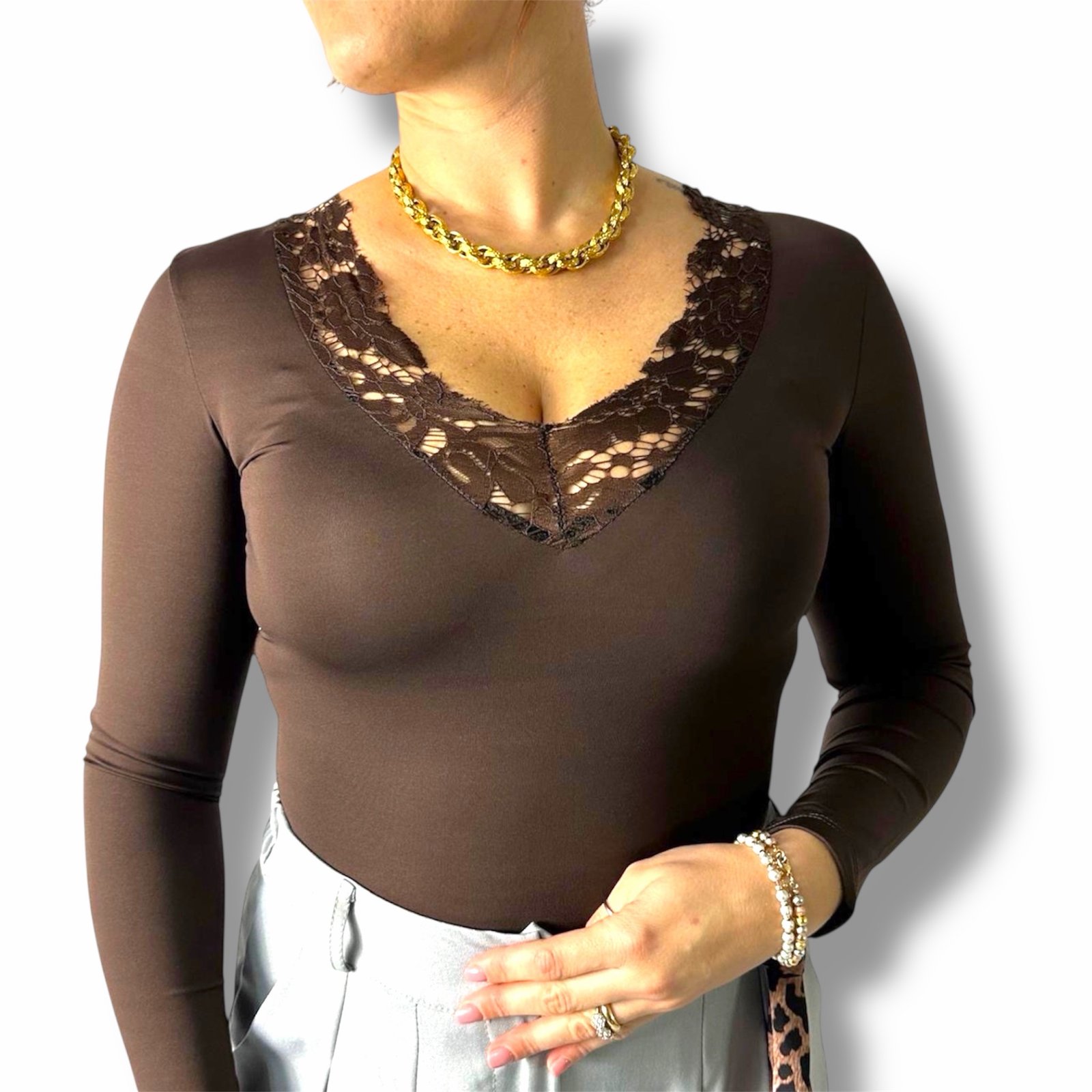Body Elegante con Scollo a V in Pizzo e Maniche Lunghe