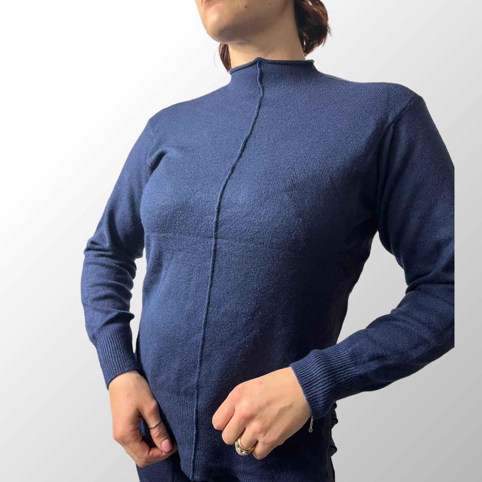 • Maglia: Modello a lupetto (collo semi-alto) con maniche lunghe e polsini a costine. Presenta una particolare cucitura verticale a rilievo sul davanti che slancia la figura.