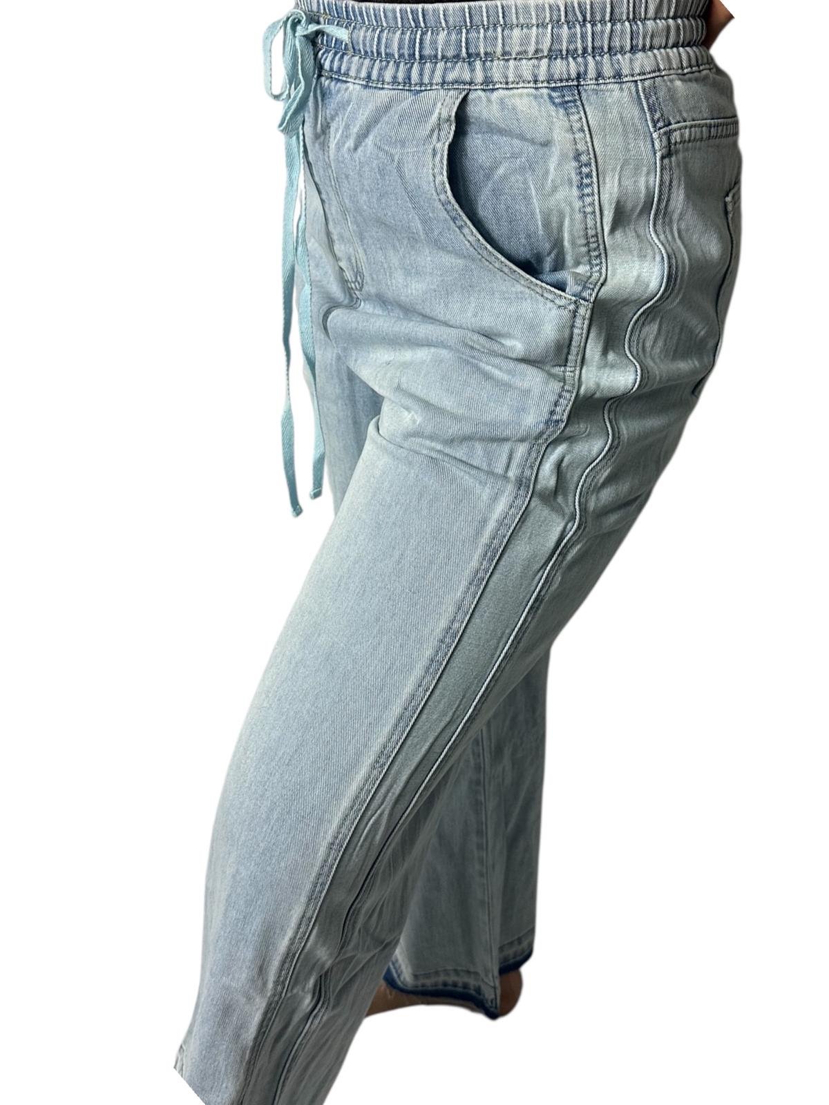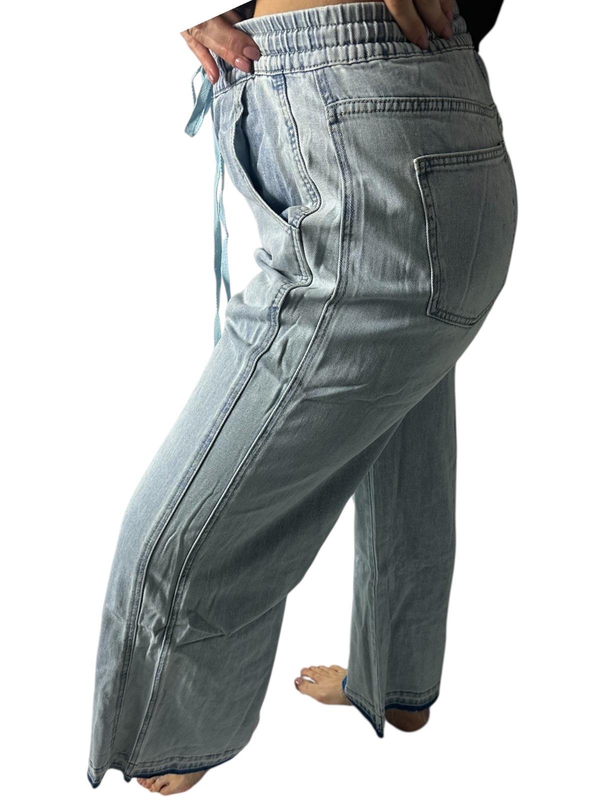 Jeans Larghi Vita Alta con Elastico e Coulisse in Denim Chiaro