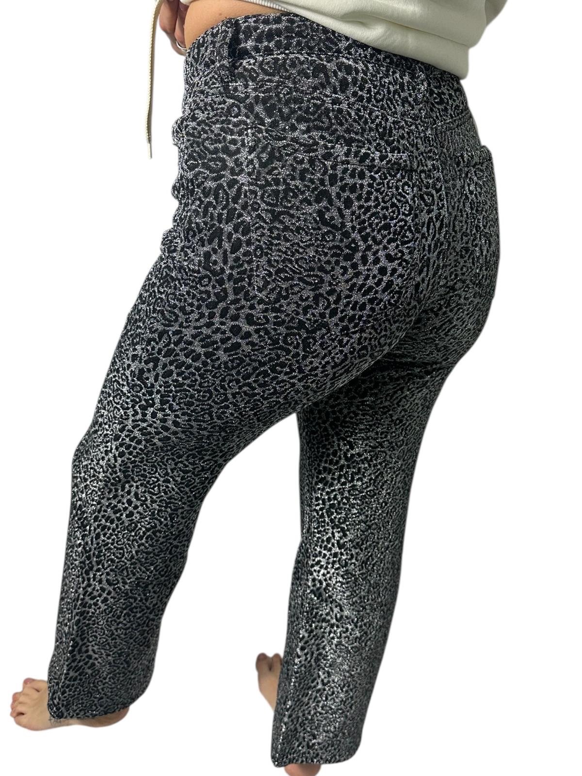 • Fantasia e Tessuto: La stampa è un vivace animalier/leopardato in tonalità di nero e argento. Il tessuto sembra essere elasticizzato e presenta un effetto glitterato o metallizzato che cattura la luce, rendendoli perfetti per le serate o per dare un tocco audace al look quotidiano.